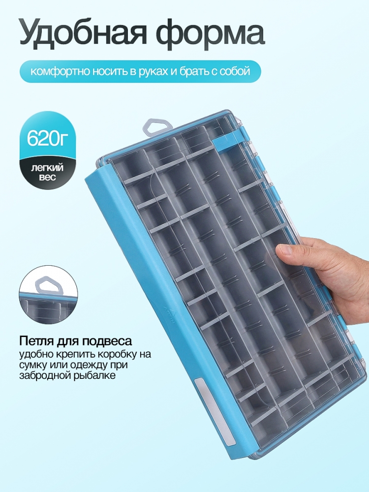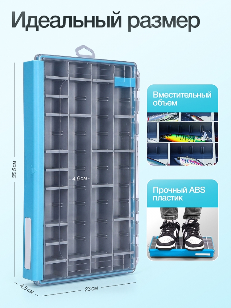 Прозрачная прочная крышка из ABS пластика позволит быстро увидеть, что внутри, и выбрать нужную приманку без необходимости открывать коробку. На крышку нанесена линейка, что позволит измерить длину улова прямо на месте.