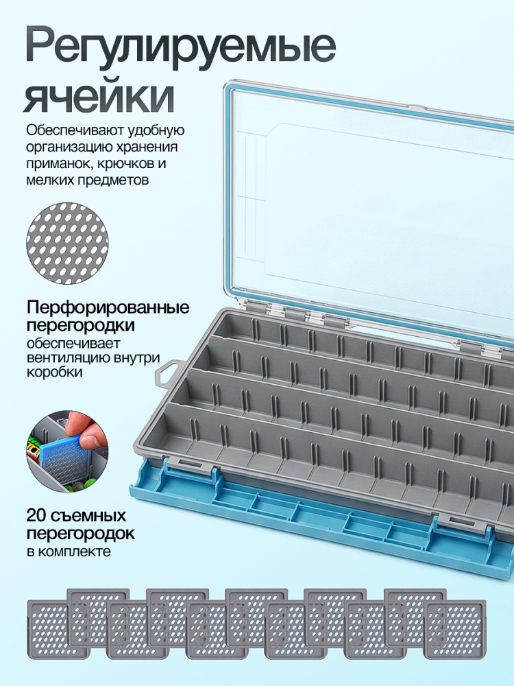 В комплекте 20 съемных перфорированных разделителей. Благодаря этому количество ячеек можно изменять от 4 до 24 – вы сами решаете, сколько отсеков нужно под крупные и мелкие приманки.